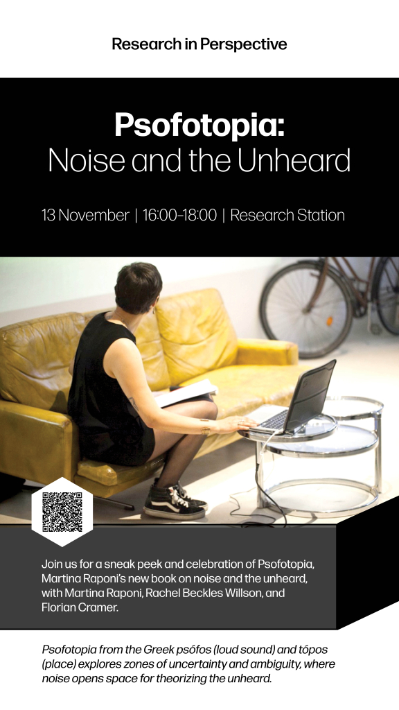 Please join us in the Research Station (WH.00.316) for a sneak peek into and celebration of Psofotopia, Martina Raponi’s new book on noise and sounding out the unheard, with Martina Raponi (WdKA tutor, Minor Visual Culture), Rachel Beckles-Wilson and Florian Cramer (WdKA research professors). No registration needed!