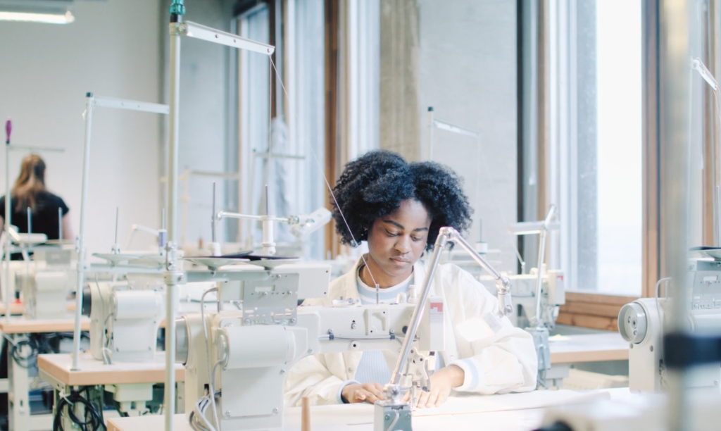 She jestingly says she looks like a twelve-year-old in a playground, as I photograph Meliange sitting on a bright blue skippy ball chair. But when discussing her struggles as a RASL student, she demonstrates wisdom beyond her years. “I received feedback not to strive for perfection. Although it is something I want, I don’t need it, because I’m here to learn. It doesn’t have to be perfect in one go.” This is also her advice to the new RASL cohort, “Don’t strive for perfection and learn from your mistakes. Dare to make mistakes in the first place! And ask for help from those around you.” At the Fabric Station, I see a different Meliange take over. She is clearly in her element. Wearing a vintage denim jacket with colourful bands across the sleeves and pockets, she tells me denim is her trademark—a love she shares with her mother. Calm and collected with a focused gaze, she constructs an ensemble within minutes using loose pieces of fabric.