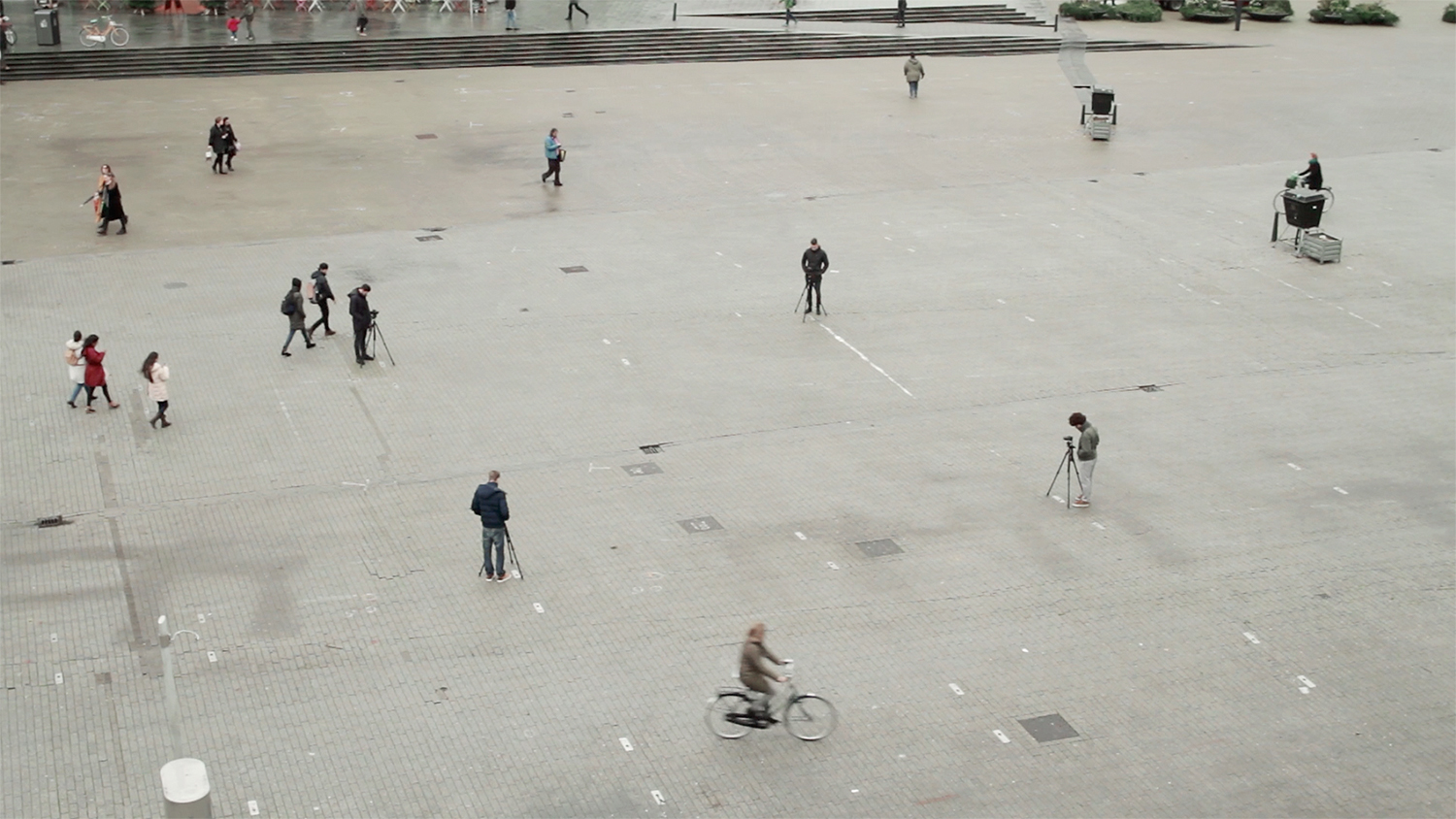 By implementing four operators in a square formation on the Binnenrotteplein and having aimed their cameras towards the center, they managed to produce symbolic borders. Their presence suggests the transition from a public zone into a ‘forbidden zone’. These forbidden zones consist of multiple variations: ‘slipping zones’, ‘prickly zones’ and ‘nervous zones’. The latter is a place that cannot be entered unnoticeably, because there is a constant surveillance by cameras.